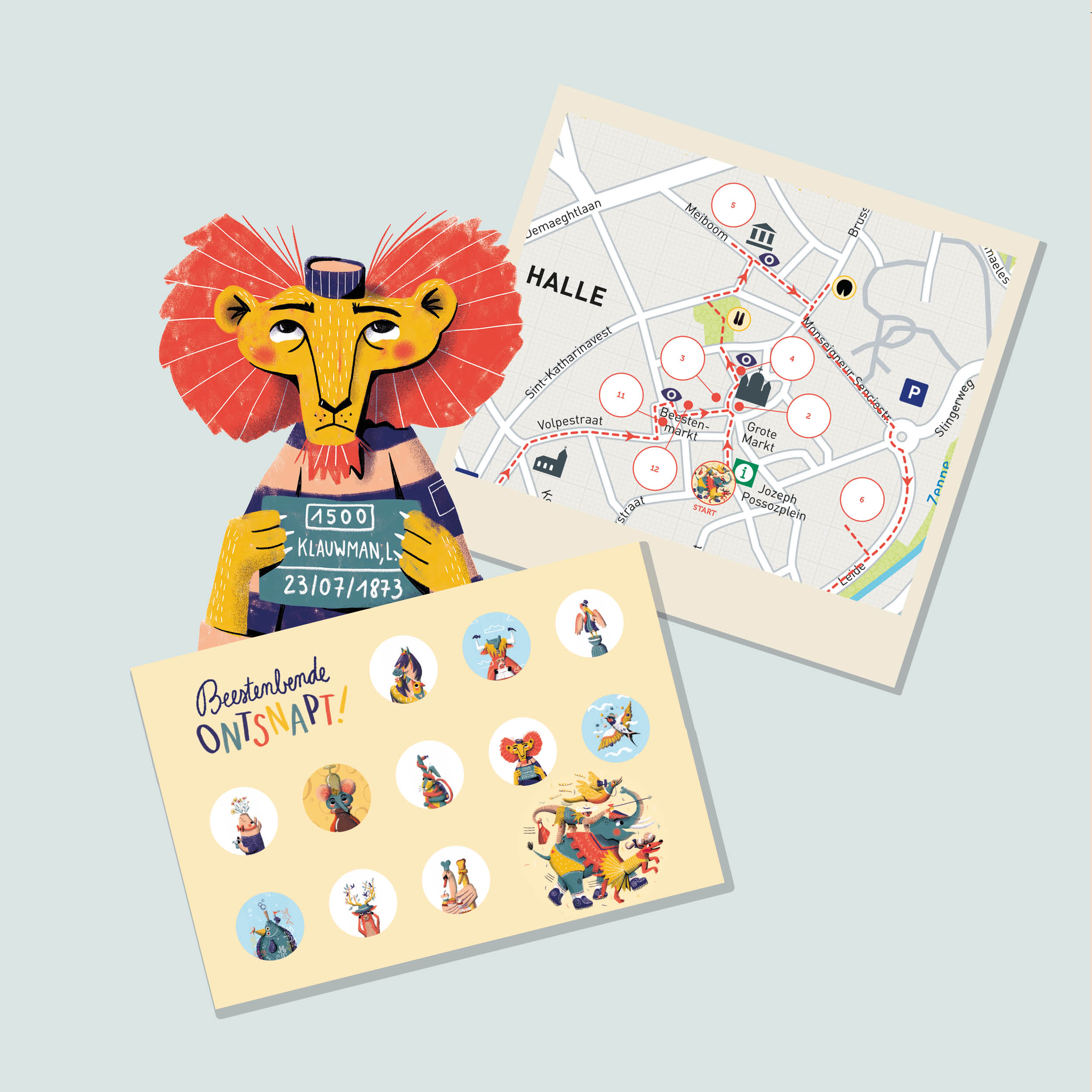 De dieren van een reizende dierentuin zijn ontsnapt en nemen de stad Halle over! Ze houden zich verscholen in een straat(naam), een huis of in de basiliek… Misschien zit Meneer Fazant wel koffie te drinken op café? Of brullen de Leeuwen het plein bij elkaar? En wat spoken die muizen toch uit in den AST?