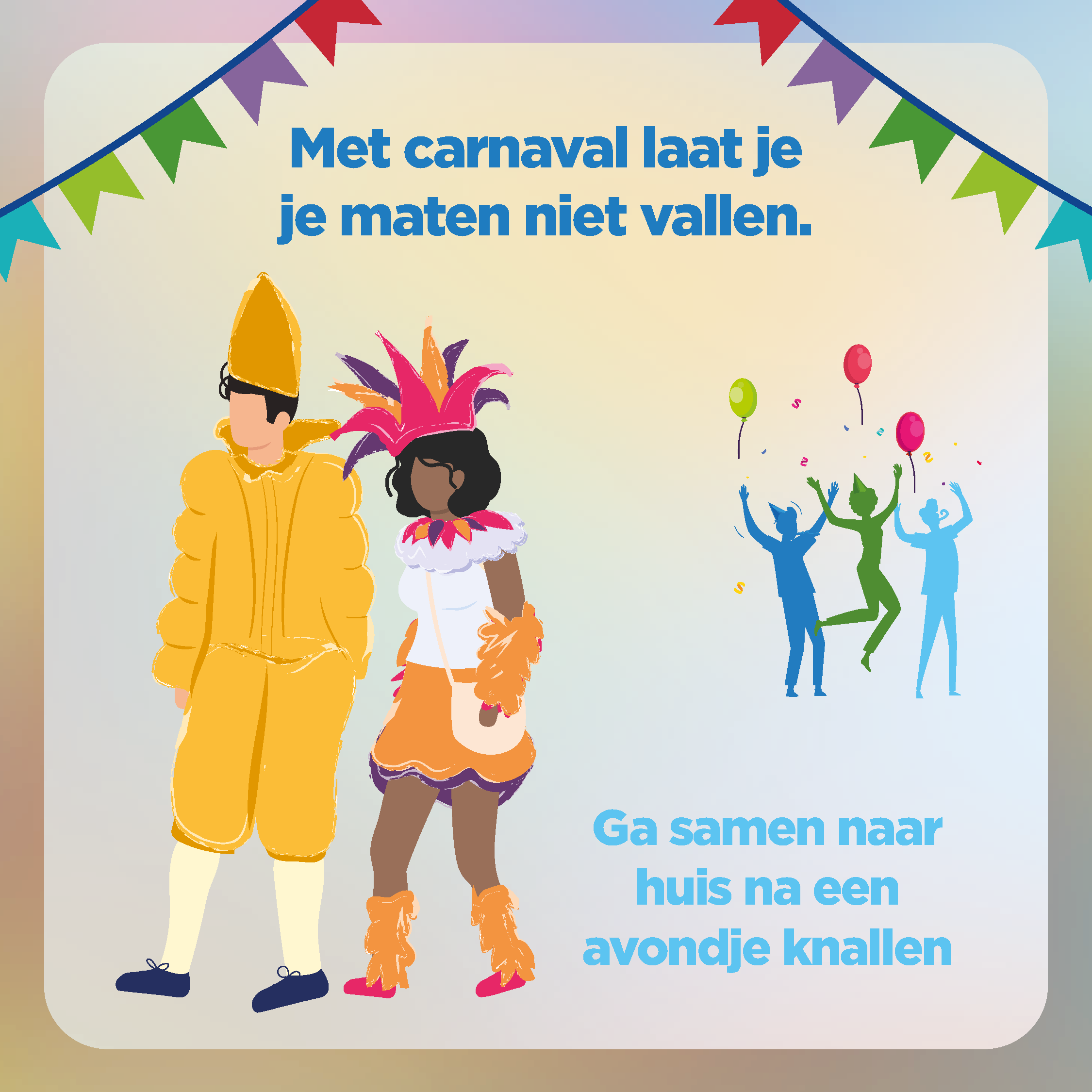 De boodschappen worden verspreid via sociale media en prijken op verschillende grote banners in de feestzone tijdens Carnaval Halle. Ook aan de toiletten hangen boodschappen uit. Zo hopen we dat de carnavalisten er samen voor zorgen dat iedereen een veilig en mooi feest beleeft.