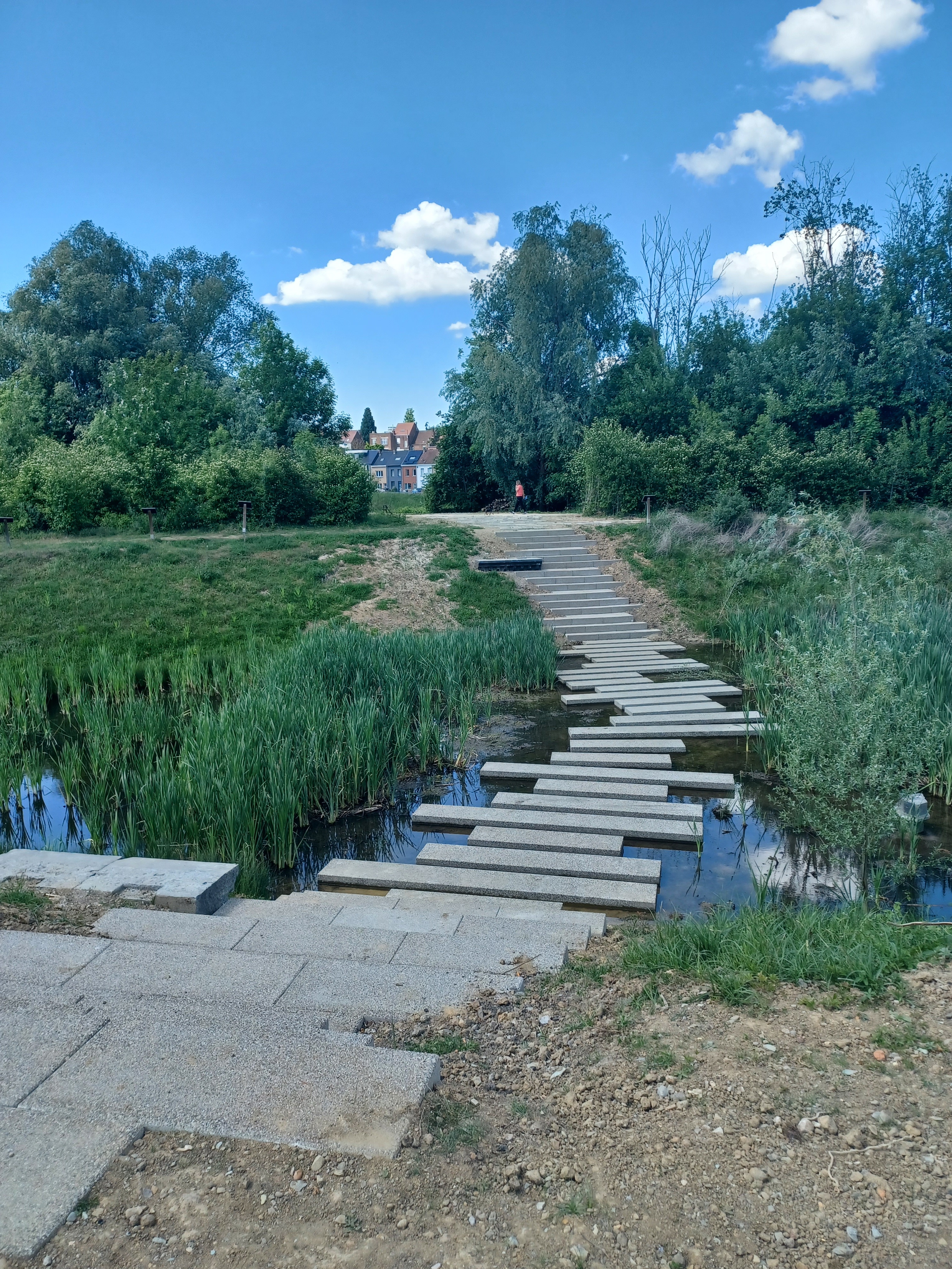 Het Zennepad doorkruist voortaan het bufferbekken aan Nederhem. Dat bekken vangt bij hevige regenbuien het overtollige water op. Je wandelt er nu door over robuuste stapstenen. Bij droog weer is dit een open en verrassende plek. Hier ontdek je ook een stukje Hals erfgoed. Rondom vind je stenen van het oude stationsgebouw van Halle. Een knipoog naar het verleden.