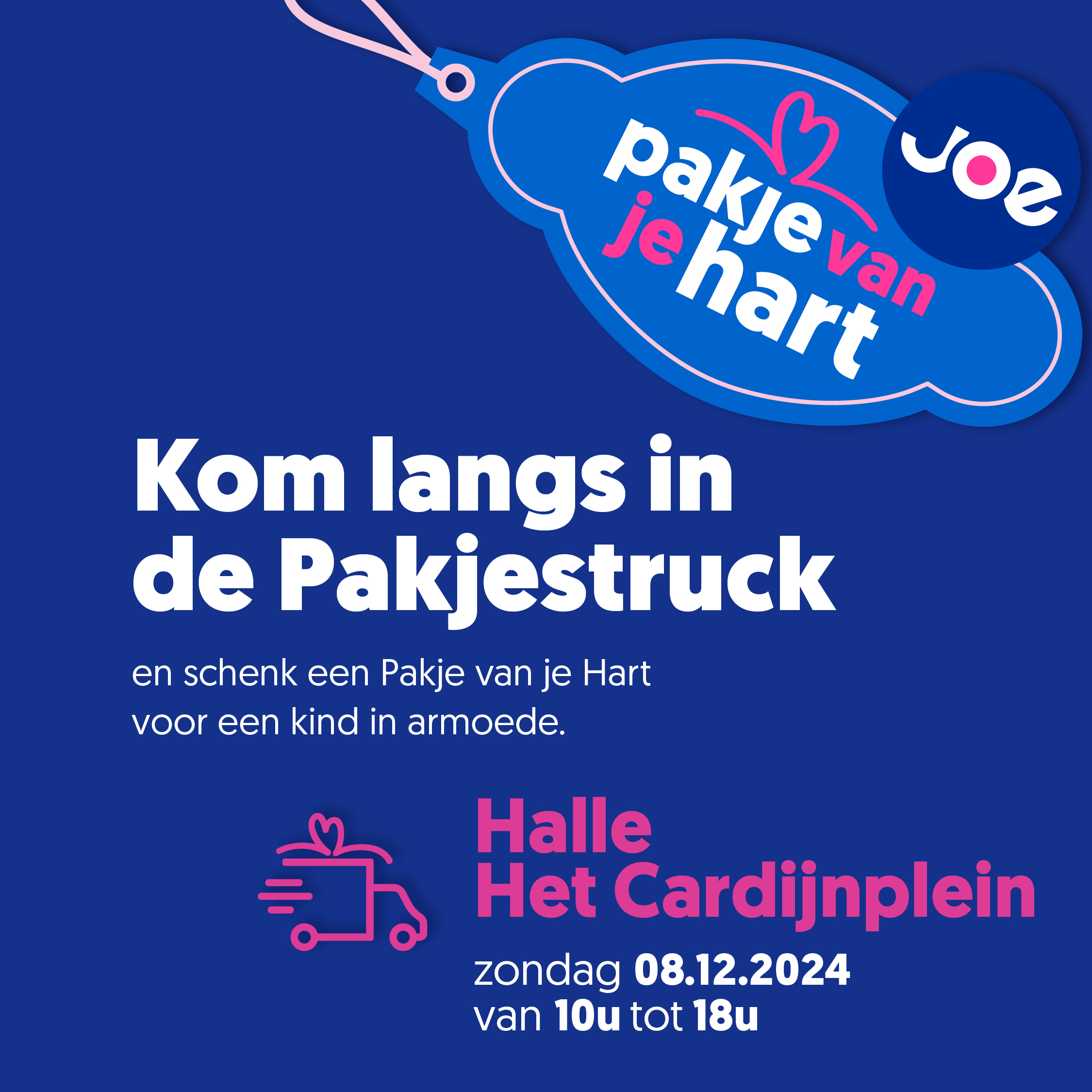 Vorig jaar bezorgde de zender zo 32.000 kinderen een magische kerst. Je kan zondag een ‘Pakje van je Hart’ schenken en een kerstcadeau voor een kind in armoede. Of kom gewoon van de sfeer genieten. Het is JOE-dj Evi Hanssen die in Halle iedereen verwelkomt. Kom dus zeker eens langs tussen 10u en 18u op het Cardijnplein.