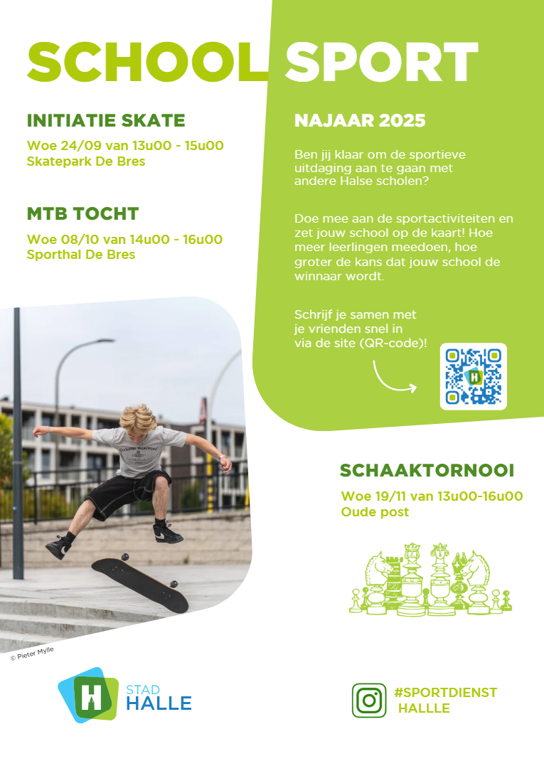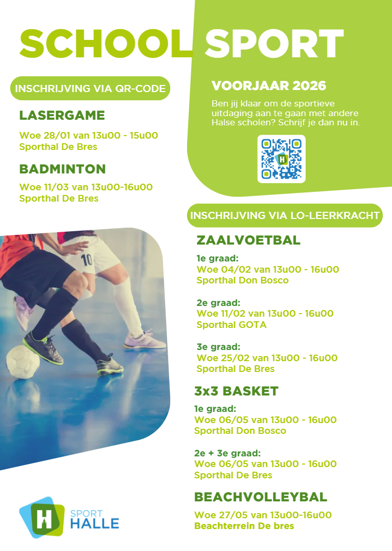 We zijn blij om ons schoolsportprogramma 2025-2026 bekend te maken! Alle leerlingen van het secundair onderwijs in Halle kunnen gratis deelnemen aan een breed aanbod van sportactiviteiten. Van teamspelen tot uitdagende sporten, er is voor ieder wat wils!